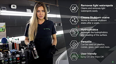 Ecoclean Jen K.O. fonctionne sur presque tous les types de surfaces pour nettoyer, briller et protéger votre véhicule. Prêt à l'emploi ! Un simple vaporisateur sur la surface pour enlever rapidement la graisse, les résidus de minéraux, la saleté, les taches d'eau légères à modérées, les taches et les impuretés assurant la protection et l'éclat du showroom.