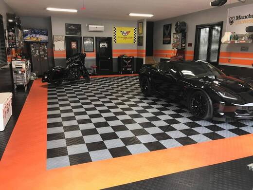 La création du garage Harley-Davidson ultime commence à partir de zéro avec la conception officielle de la barre et du bouclier, exclusivement par RaceDeck. Le revêtement de plancher Harley-Davidson possède les mêmes caractéristiques brevetées que celles de tous les revêtements de plancher de garage RaceDeck.